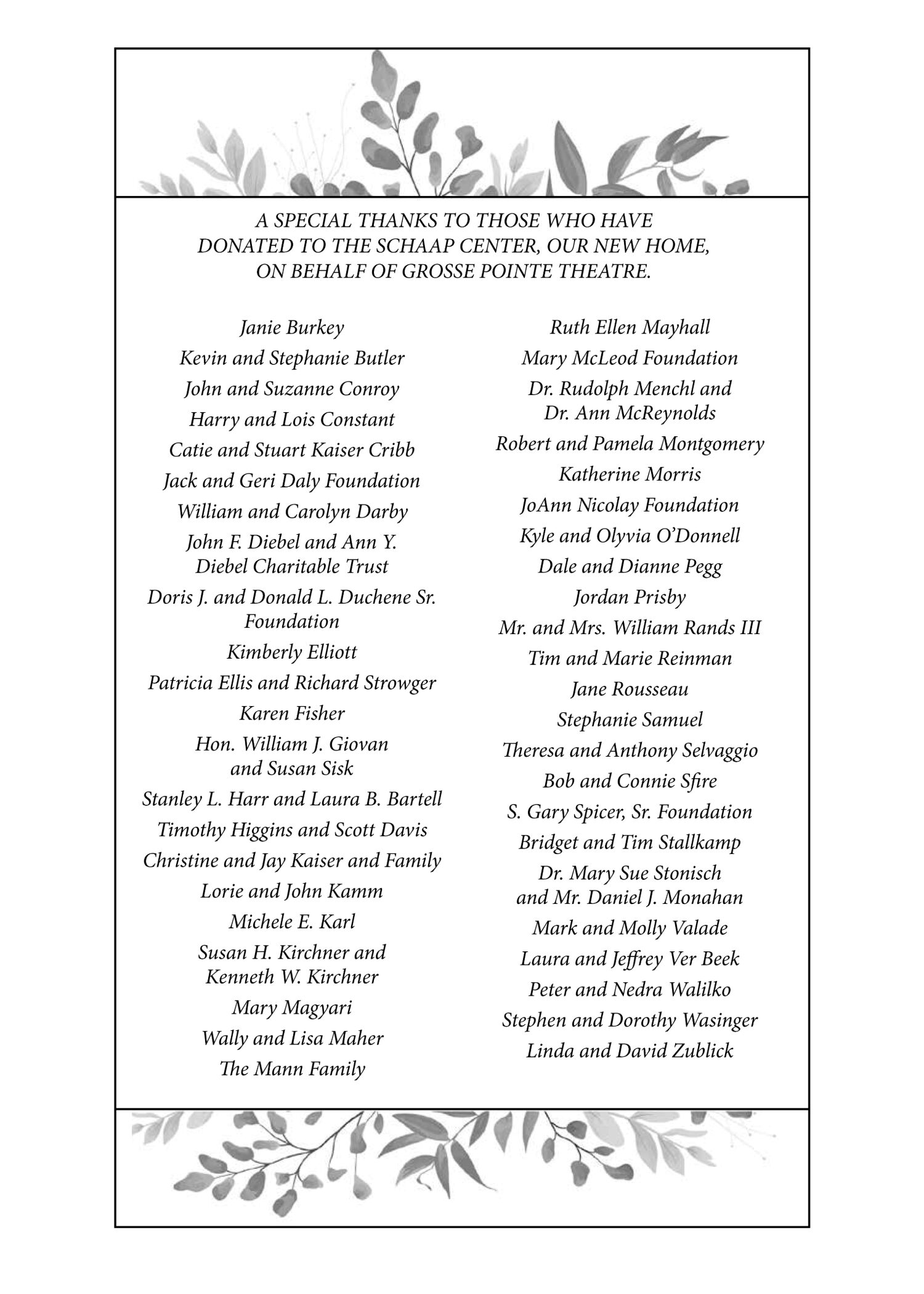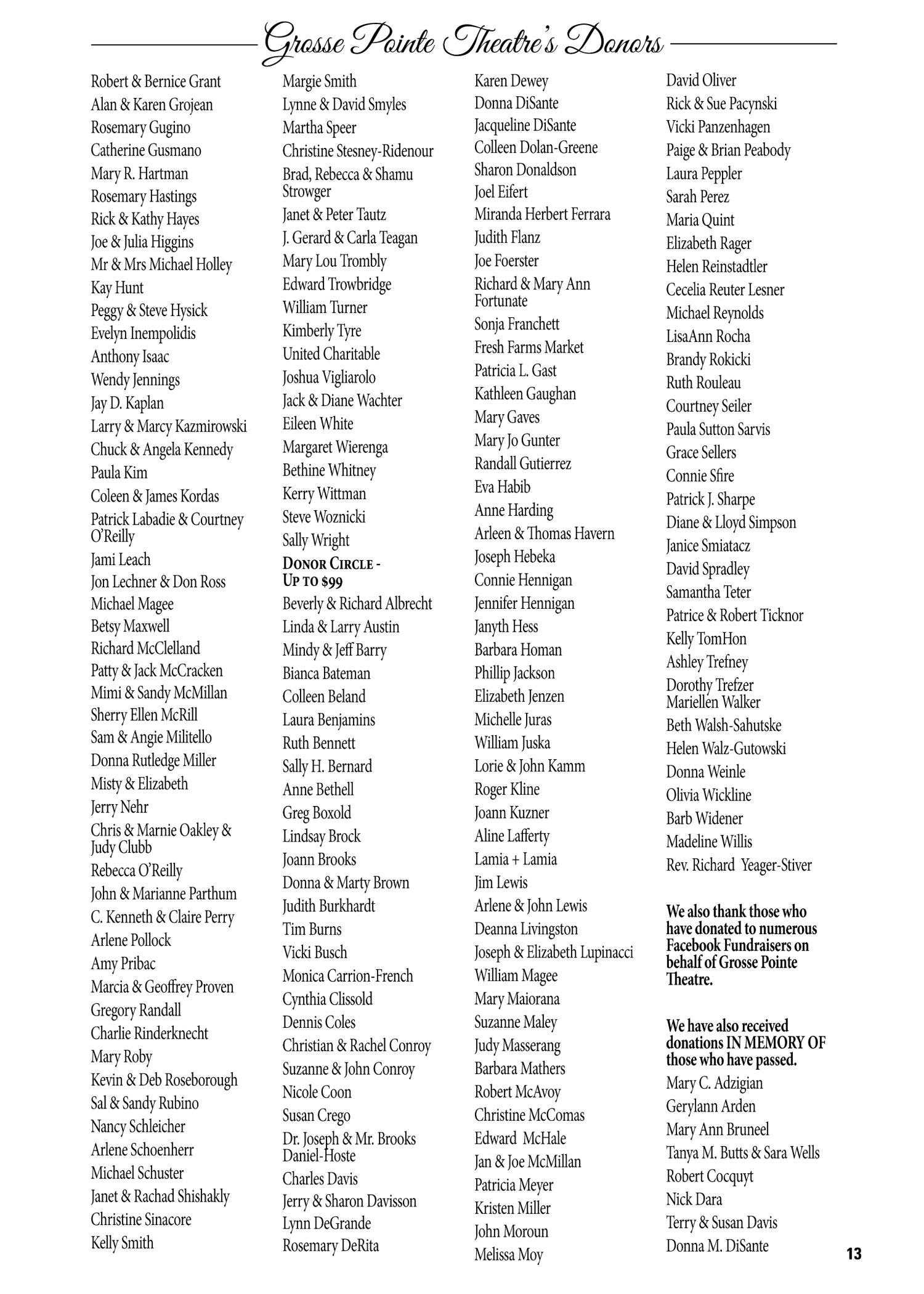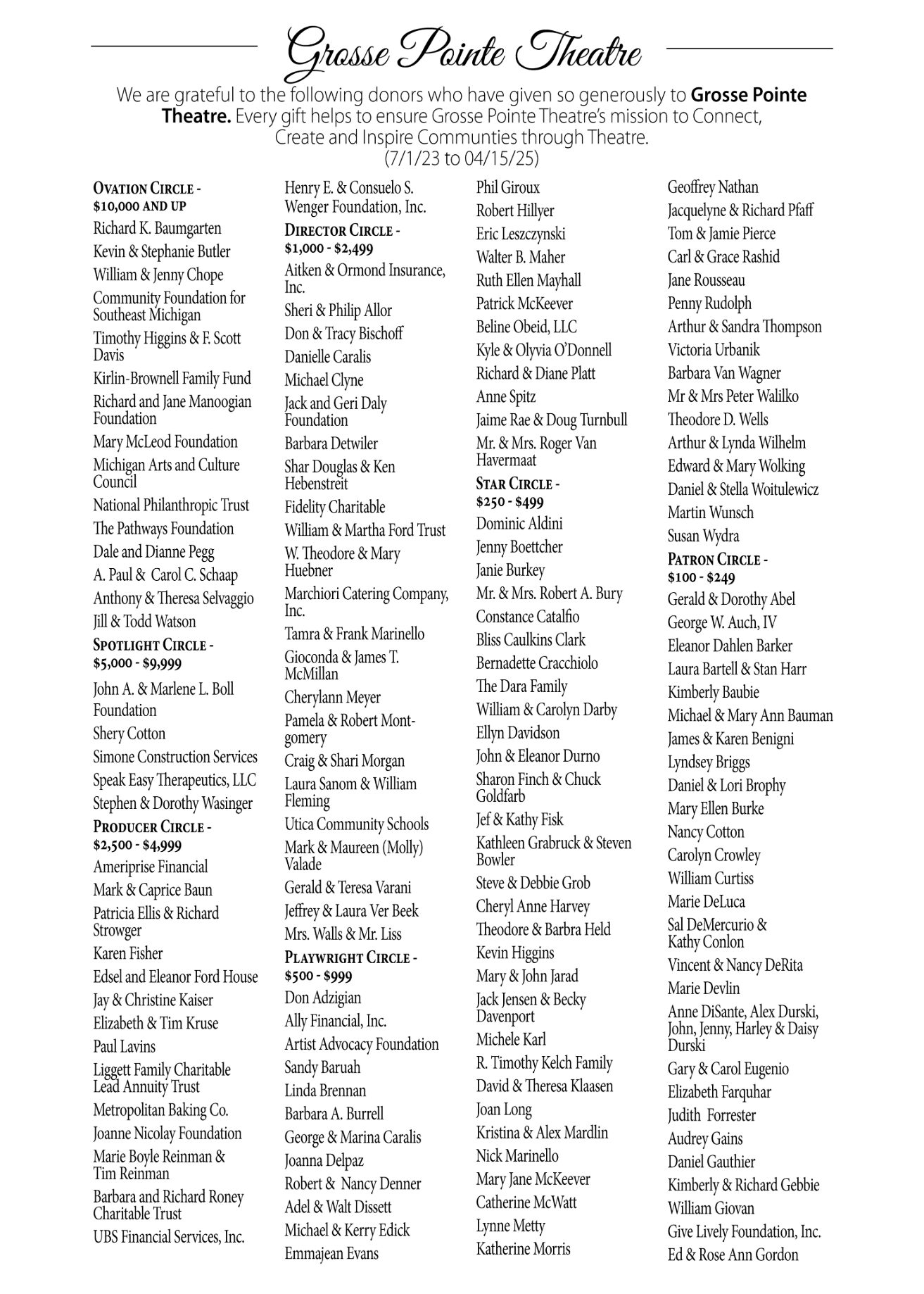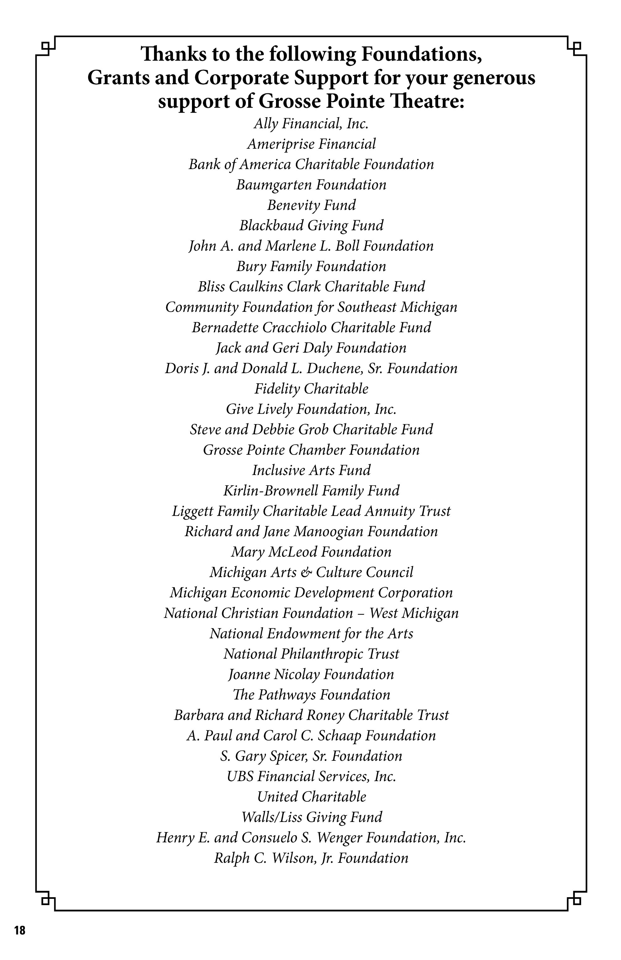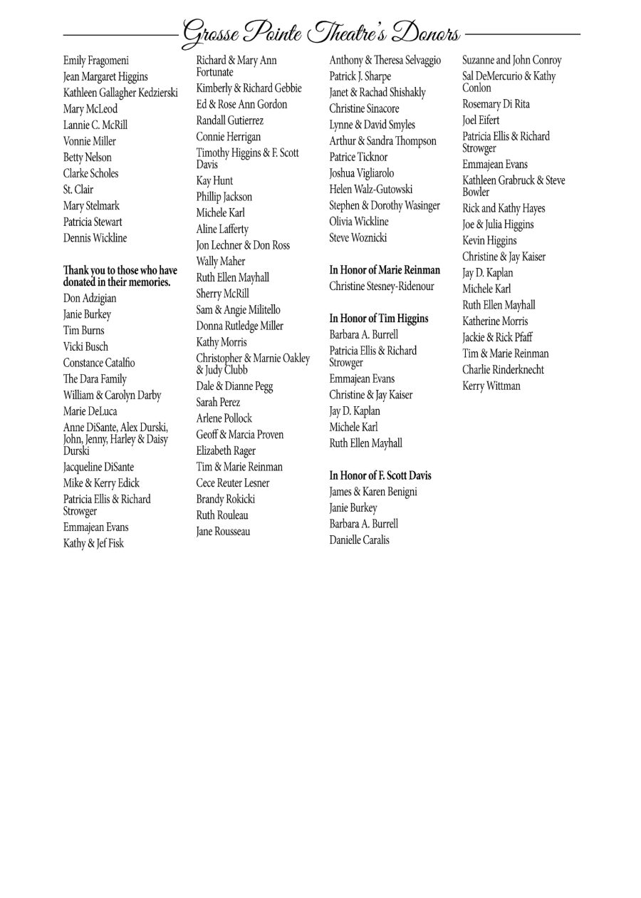 Thank You to all of our Donors and Sponsors We thank you for supporting the continued success of Grosse Pointe Theatre and its outreach to the community ;